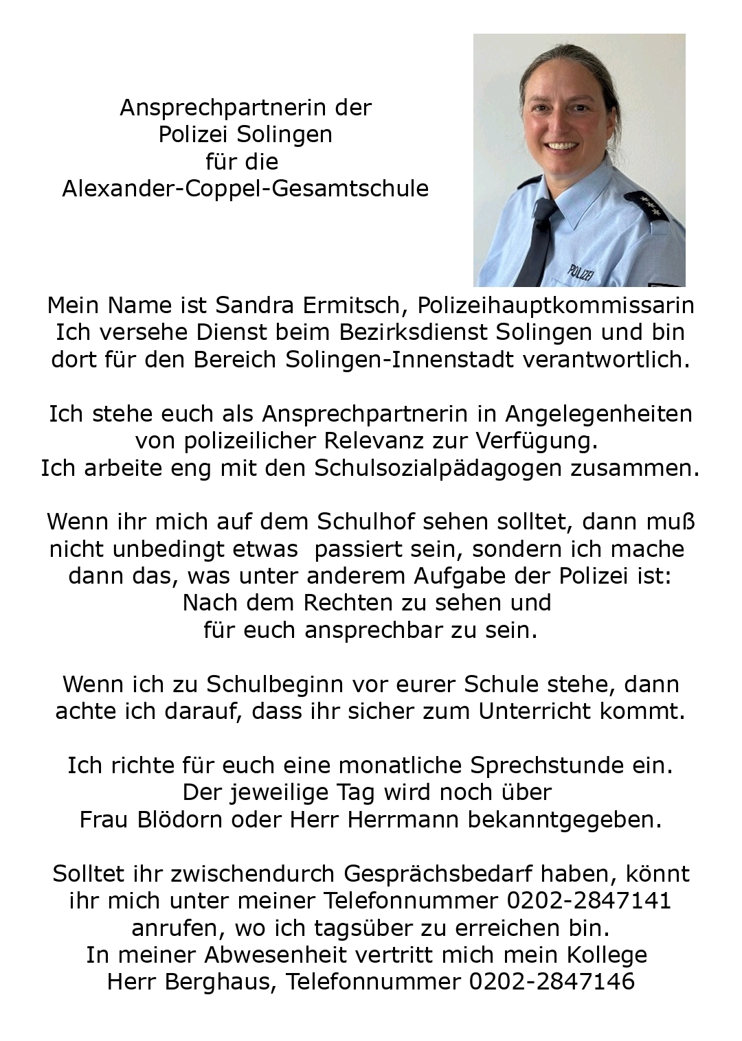 Herr Boehnke, der in den letzten Jahren in seiner Funktion als Bezirkspolizist für uns zuständig war, hat innerhalb der Solinger Polizei neue Aufgaben übernommen.