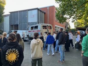 wir hatten heute am Dienstag, den 23.09.2025 Besuch eines ukrainischen Krankenwagens an der Schule. Die Barwinka ist ein (sehr) alter Krankenwagen aus Derhatschi in der Region Charkiv, welcher nach der russischen Invasion wieder aktiviert wurde, da der Bedarf an Krankenwagen extrem gestiegen war. Im März 2022 wurde sie während eines Einsatzes mit Streumunition beschossen, wobei der Fahrer schwer verletzt wurde. Glücklicherweise hat er überlebt.