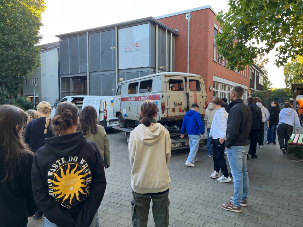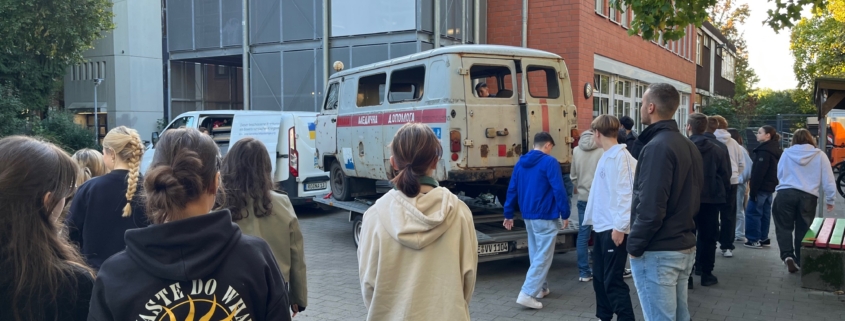 wir hatten heute am Dienstag, den 23.09.2025 Besuch eines ukrainischen Krankenwagens an der Schule. Die Barwinka ist ein (sehr) alter Krankenwagen aus Derhatschi in der Region Charkiv, welcher nach der russischen Invasion wieder aktiviert wurde, da der Bedarf an Krankenwagen extrem gestiegen war. Im März 2022 wurde sie während eines Einsatzes mit Streumunition beschossen, wobei der Fahrer schwer verletzt wurde. Glücklicherweise hat er überlebt.