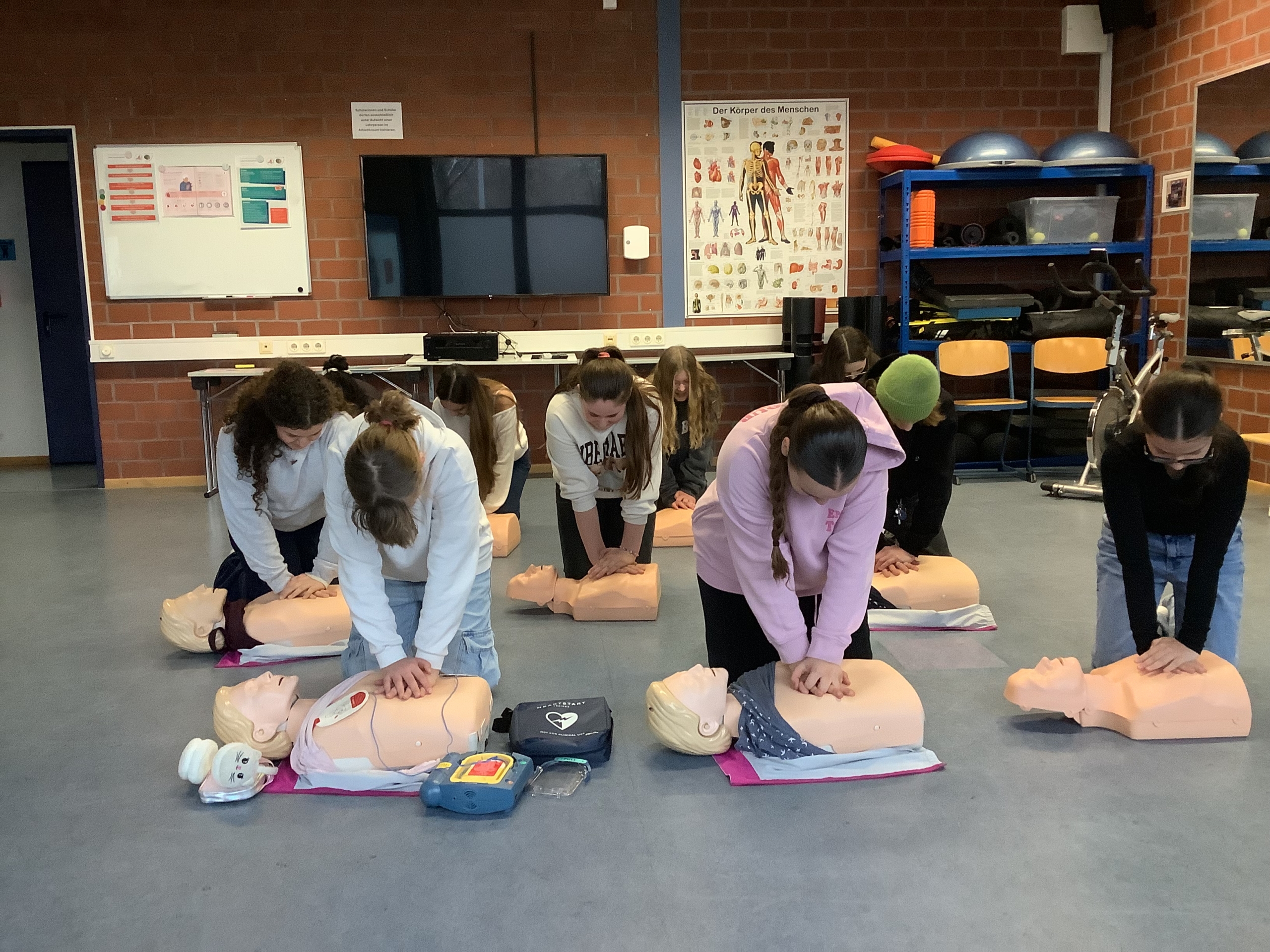 Schon lange lernen an der ACG alle Schulsanitäter:innen die Herz-Lungen-Wiederbelebung (HLW), seit diesem Schuljahr mit der Unterstützung des Roten Kreuzes. Am Tag der offenen Tür können auch schon Viertklässler:innen die Herz-Druck-Massage ausprobieren und die Lehrkräfte werden regelmäßig in Erster Hilfe fortgebildet. Neben den vier Übungspuppen von den Bergischen Lebensrettern verfügt die Schule nun über 15 weitere Übungspuppen, mit denen trainiert werden kann. Nun wird ab dem Schuljahr 2026/27 der Reanimationsunterricht an Schulen im Bereich der Sekundarstufe I in NRW verpflichtend eingeführt. Denn im Notfall helfen bisher zu wenige. Bei einem Herz-Kreislauf-Stillstand führen bisher nur etwa 45% der Anwesenden eine Herzdruckmassage durch. Unsicherheit und fehlendes Wissen können ein Grund dafür sein, dass die HLW nicht ausgeübt wird. Das soll sich ändern. Im Sportunterricht lernen die Schüler:innen zukünftig, wie sie im Ernstfall reagieren müssen. „Prüfen, rufen, drücken“ wie es schon im „Lebensretter-Song“ heißt, an dem Daniel Schnäbelin mitgearbeitet hat, rettet Leben. Zusätzlich kann an der ACG auch ein Laien Defibrillator (AED) eingesetzt werden, denn seit über 15 Jahren besitzt die Schule ein eigenes Gerät, seit einigen Jahren sogar ein zweites, um bei einem Herzstillstand rechtzeitig eingreifen zu können.
