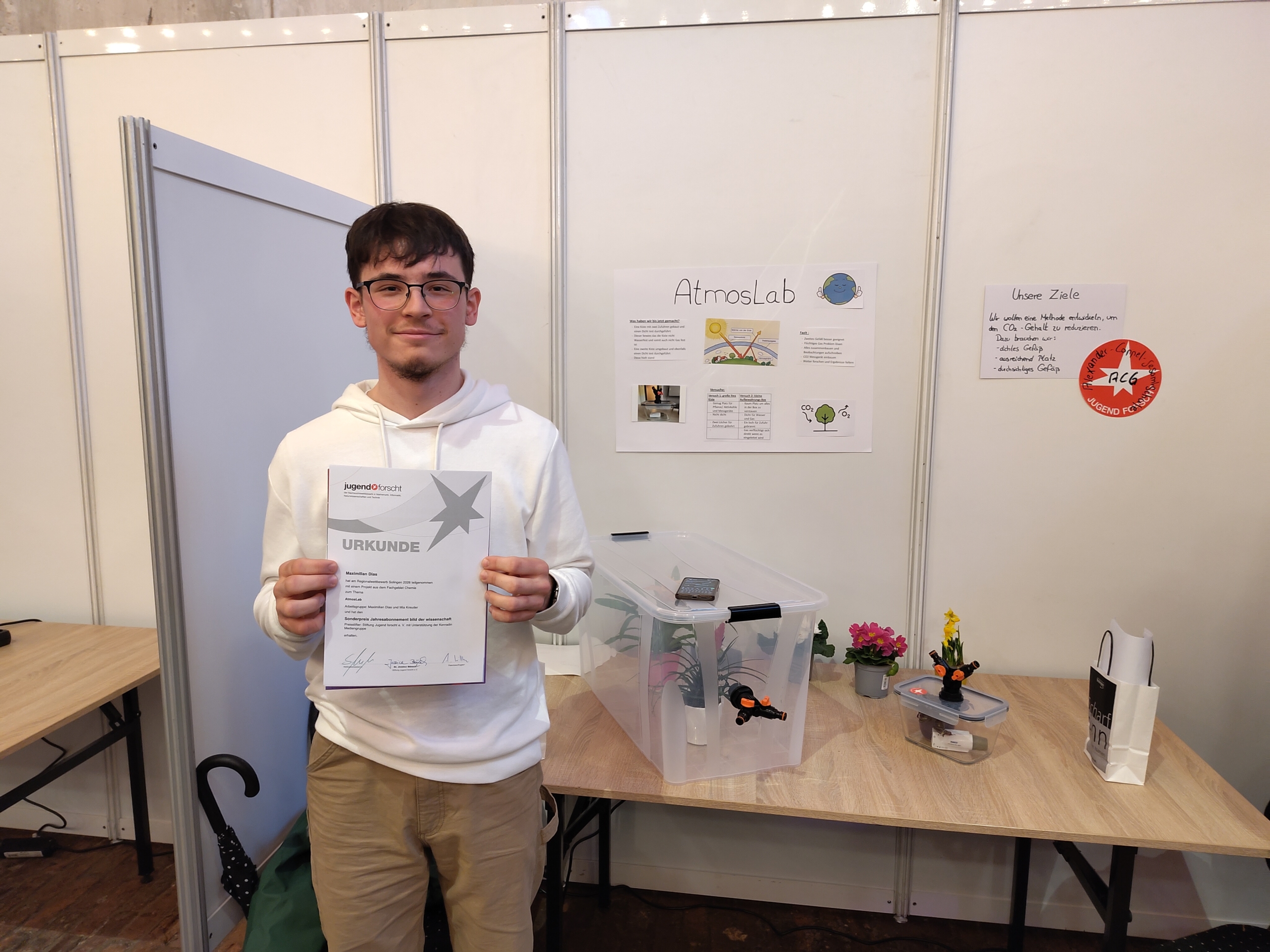 Im Januar mussten wir zunächst unsere wissenschaftliche Arbeit abgeben, bevor es dann am 21.02.2026 im Regionalwettbewerb in Solingen losging. Wir gingen mit unserem Projekt „AtmosLab“ an den Start, obwohl wir noch viel mehr vorhatten und zeitbedingt noch nicht alles umsetzen konnten.